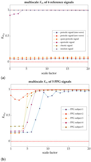 The multiscale for several reference signals, as well as for PPG signals, acquired from five individuals chosen at random [computation time per signal in a server cluster consisting of 10 computing nodes, with a total of 64 cores and Intel Xeon architecture, and 166 GB of memory: 6 h 7 min and 7 s]. (a) Multiscale for two periodic signals, one quasi-periodic signal, one aperiodic signal, one chaotic signal, and a random signal; almost all the signals have recurrent dynamics at all different scales; (b) PPG samples (five individuals chosen at random). All of them, regardless of their dynamics on a small timescale, trend to a on a large timescale.