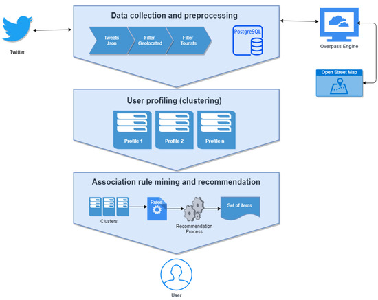 Figure 1 presents the architecture of the system, which has three basic stages. First, data from a collection of users that have visited a destination is collected from Twitter, pre-processed and stored in a PostgreSQL database. Some pertinent information about geolocations is extracted from Open Street Map. Features are then extracted after filtering unwanted data. In the second stage, a clustering process is performed to uncover user profiles (groups of visitors with similar characteristics, preferences and patterns of travel). In the final stage a set of association rules is mined for each cluster. These rules describe POIs frequently visited together by the members of that cluster. Finally, these rules are employed to provide personalised recommendations to a particular user. The following subsections describe these stages in detail.