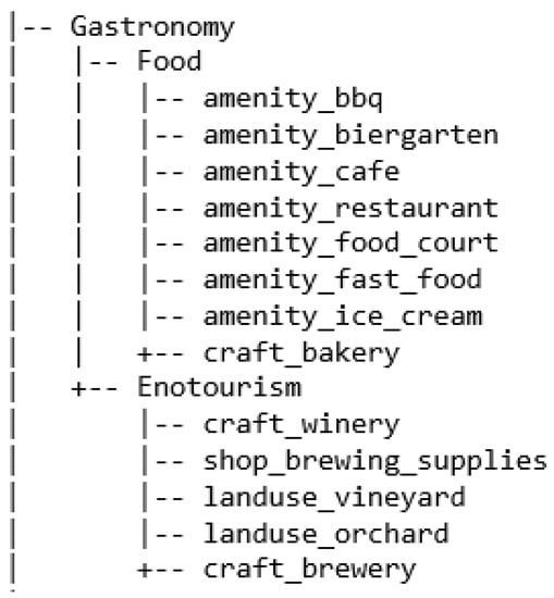Figure 2. Sample chunk of the Activity tree, showing the main category “Gastronomy”, its subcategories “Food” and “Enotourism” and the OSM tags associated with them. - Overpass turbo [55]: It is a query server for requesting specific features in the OSM database. Overpass provides a query language (Overpass QL [56]), similar to Structured Query Language (SQL), to help users gain access to specific information in the OSM database. For example, physical features within a certain radius from a coordinate pair can be requested and filtered by their OSM tags.We used the Overpass query language to request all POIs within a certain range around the coordinates of a touristic tweet. These POIs were OSM map features categorised as Nodes, Ways, Relations or Areas. Nodes are single structures, such as office buildings, which include coordinates to represent their locations. Ways consist of several nodes with individual coordinates, which represent structures such as roads, highways, streets, pathways, plaza, fountains, parks and steps. Relations are compound structures which include several nodes and ways. For example, complex attractions comprising multiple buildings such as Sagrada Familia are relations. Finally, Areas are large physical features that are represented by bounding boxes. Areas contain several nodes, ways and relations. For example, the Port Aventura theme park in Spain is categorised as an area, because it contains several attractions over a large area.This Overpass query requests all named nodes, ways and relations within a 50 m radius from the coordinates of a tweet, also including the areas if they are not cities, countries, towns or time-zone boundaries.Figure 3 shows the code snippet written in Overpass QL. Line 1 [out:json] sets the query output as JSON and [timeout:1000] sets the wait time in seconds before the query is terminated. Line 2 'nwr' requests all nodes, ways and relations 'around' <Lat>,<Lon> within the radius of <displacement> meters, and [∼"∧name(:.*)?$"∼"."] filters out unnamed map features. Line 3 requests all areas bordering the <Lat>,<Lon>. Lines 4 and 5 filter out all areas that are cities, towns, countries and time-zone boundaries. Finally, line 6 formats the results, 'out geom' gets the full geometry of results, 'tags' includes IDs and tags of the results and 'qt' sorts the results by their geometry.