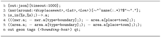 Figure 3. Code snippet of an Overpass query. - NLTK [57]: Natural Language Toolkit (NLTK) is an open source toolkit for Natural Language Processing written in Python. It is widely used because it includes a large number of tools for text analysis and it is very well documented. The NLTK library is used to pre-process the text of each tweet. The text is first stripped of stop words based on its language, and then separated into tokens with the NLTK tweet tokenizer. URLs and links of any form are removed, and hashtags composed of several capitalised words are split (e.g., #SagradaFamilia). Finally, numbers, icons, accents, punctuation, user mentions (i.e., user tags beginning with “@”) and excess letters in words, such as “funnnn”, are also eliminated. Once tweets have been processed, they can be compared with the names of the POIs returned from Overpass to find matches.The NLTK evergram tool is used to make n-grams of the POI names returned from Overpass. In this way it is possible to detect hashtags that contain POI names which could not be split in the pre-processing step.