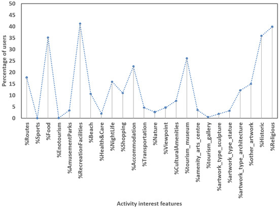- Other features related to the activity tree. In the analysis it was found out that the OSM tag {tourism, artwork} was quite popular in our data set, but we did not know what type of artwork was being experienced. Thus, it was decided to break down this tag into several features that represent the type of artwork, using other tags associated with the POIs. These features are %artwork_type_sculpture, %artwork_type_architecture, %artwork_type_statue and %other_artwork. The last one represents cases of undetermined type or works of art that do not belong to the other three types. Figure 4 shows the 24 activity features and the percentages of users that visited them in Barcelona (according to the content and the location of their tweets). It may be seen that the top categories were RecreationFacilities, Religious, Historic and Food, followed by Museums and Accommodation.