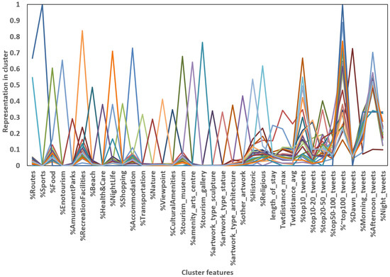 Figure 5 shows a graphical representation of each cluster with a different colour; features are on the x-axis and the mean value of each is on the y-axis. The clusters display different combinations of peaks across the clustering features, showing high heterogeneity (especially in the activity interest features). On the contrary, temporal features do not exhibit great differences among the clusters. The high heterogeneity in activity features allows the recommendation of different POIs across clusters.