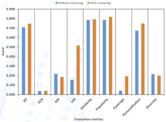 One of the possible solutions to the cold start and data sparsity problems in recommender systems is to cluster users or items to gain generalised information about them. For instance, Liji et al. proposed an evolutionary algorithm to cluster user attributes before building a user–item matrix for collaborative filtering [30]. Ma et al. went a step further by combining three clustering processes (based on user trust, user similarity and item similarity) to form the user–item matrix and then using the matrix factorisation model to make predictions [31]. Following the same trend, Nguyen et al. proposed grouping users by their cognitive similarity, determined by their interest in similar items, to handle the cold start and data sparsity problems [32,33]. Along the same lines of user similarity, Fränti et al. compared the similarity of users via different factors (location visit frequencies, opinions and liked pages) to improve the recommendations [34]. The same authors also considered the sparse location histories of mobile users to find similar users even if a user’s trajectory was incomplete [35].