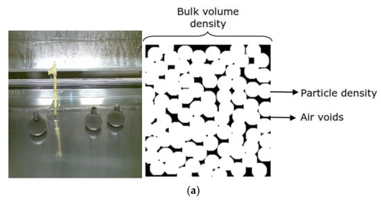 One of the earliest references in 1915 is the work of Richardson on bitumen-filler suspension []. The role of the filler is not only void-filling, but it also includes some sort of physicochemical interaction between filler and bitumen. Limestone and Portland cement are considered to be better fillers as they adsorb a thicker layer of bitumen. The packing of filler plays an important role in the properties of mastics. The void content of the filler is the most important parameter to influence the properties of a mastic []. In 1947, Rigden showed that interaction between bitumen and filler is best explained by the theory of packing particles []. According to Anderson and Goetz, the Rigden work on fillers provides a baseline for research on fillers. The Rigden voids incorporate the effect of the secondary properties of the filler in mastic suspension [,]. These properties include bulk density, fractional voids, void diameter, and permeability of fillers, etc. The secondary properties are dependent on the intrinsic (primary) properties, including particle density, shape, texture, grain distribution, and surface area.