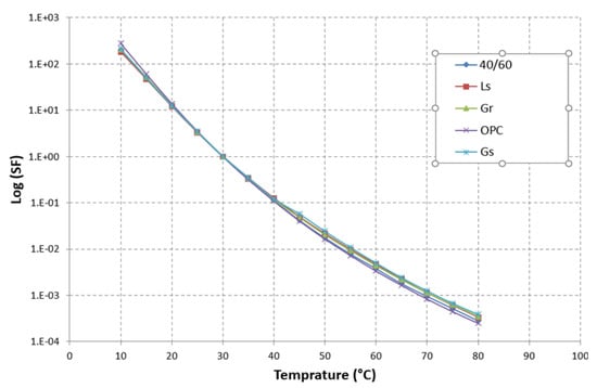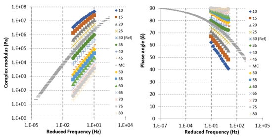 The value of complex modulus (G*) at different temperatures (10–80 °C) was plotted against frequency. The curves at each temperature were transposed to generate a single response (known as a master curve) through the use of shift factors. The curves were shifted at a reference temperature of 30 °C, as shown in Figure 3. The shifting was performed by the use of the time–temperature superposition principle (TTSP). An optimisation technique was used for the complex modulus and phase angle isothermal plots to construct master curves. The initial shift factors served as a base value for optimisation and were calculated using the Williams–Landel–Ferry equation (WLF) through DSR software. The shifting factors, in a real sense, were calculated using the method termed ‘numerical, non-linear least square shift’ []. In this method, the shape factors of the sigmoidal function and shift factors (for various complex modulus isothermal plots) were solved simultaneously using non-linear least-squares fitting []. This was achieved using the Solver function in MS Excel. This has the advantage of not assuming any functional form of relationship of shift factor vs. temperature.