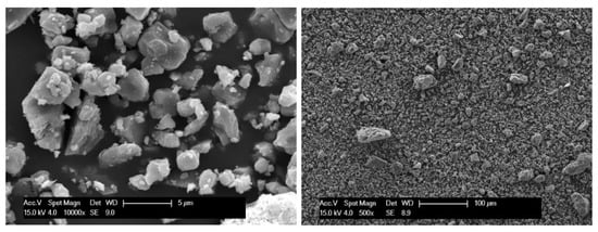 The particle shape and surface texture were determined through Scanning Electron Microscopy (SEM). The electron beam was scanned directly on the material’s surface, and this produced various signals, which were then analysed []. In this research, the backscattered electron imaging (BSE) was used to determine the shape of the particle at spot magnification levels 500× and 10,000×. The acidic/basic character of fillers was examined through mineralogical analysis. XRD helped to quantify different types of minerals, which dictates the properties of fillers. Filler particles were composed of various minerals; each of these minerals has a different crystalline structure and chemical composition. The composition of minerals has its effect due to complex processes that occur at the surface of mineral aggregate and its affinity both for bitumen and water.