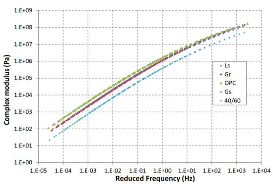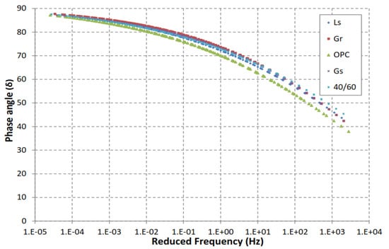 The addition of ordinary Portland cement (OPC) has a considerable effect on the mastic stiffening potential of mastics (Figure 5). Similar behaviour is observed from phase angle master curves (Figure 6). The stiffness of OPC is attributed to its effective volume in this mastic. OPC mastics have more Rigden voids in the same volume and subsequently more fine particles. The limestone filler has a lower effective volume as compared to gritstone and granite. It is expected to have a less stiffening effect in comparison with the two fillers. However, limestone has a similar stiffening effect. A possible explanation is that limestone is a basic filler. It is thus expected to increase the stiffening as per Winniford when compared to gritstone and granite (acidic fillers) []. The acidic fillers result in lower viscosity, while basic filler results in a higher viscosity of mastic. The theory that basic fillers have more stiffening potential explains the behaviour seen in the phase angle master curves.