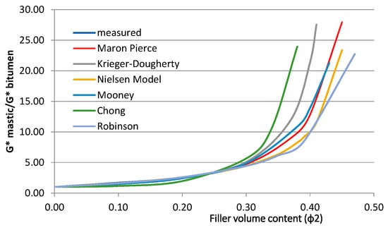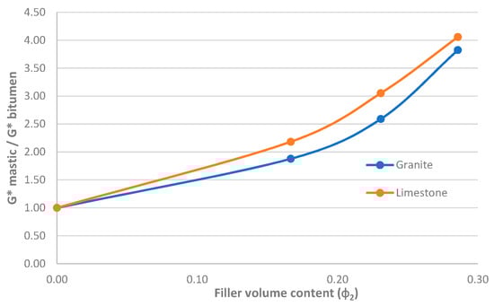 The limestone (basic) and granite (acidic) fillers were selected to measure and predict the stiffening effect of fillers. In Figure 8, constructed using the data of research, mastic stiffness modulus increases with the increase in filler content. The filler content is defined as φ2 , where V1 is filler volume while V2 is bitumen volume. A discussion on the effect of variables on stiffening potential in the models can be found elsewhere [].