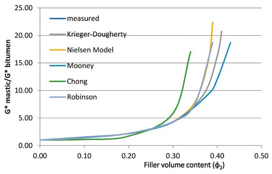 It is difficult to precisely model the mastic data with any single model due to the presence of complex stiffening effects beyond volume filling. The stiffening effect is complicated by the presence of the adsorption layer. This increases the effective volume of filler and will eventually reduce the maximum packing ϕm in suspension. Although models somewhat accurately predicted the stiffening potential of fillers, they only account for volume filling and exclude the physicochemical interactions.