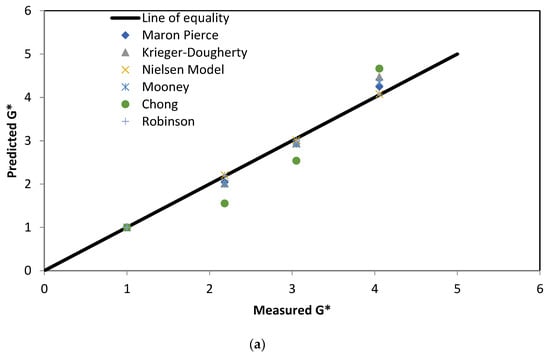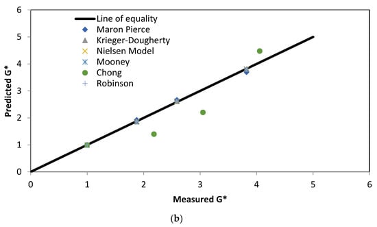 A model to predict the stiffening effect of spherical particulates in suspension was given by Mooney []. They made use of a self-crowding factor ‘k’. This factor was inverse of the maximum packing fraction. In Equation (11), for a monodisperse system, it is mentioned as 1/φm. Gm and Gb are the shear modulus of the mastic and bitumen, respectively. The factor ‘2.5’ in the equation refers to Einstein’s coefficient KE [].