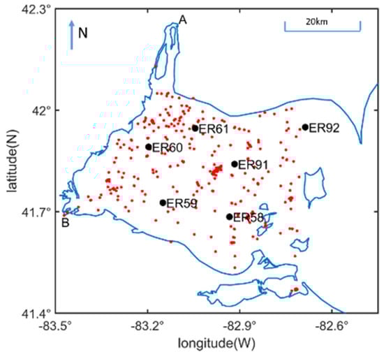 Map of Lake Erie and data sites. Detail of western basin shoreline showing the Detroit River (A), Maumee River (B), NOAA (red dots), and GLENDA (black dots).