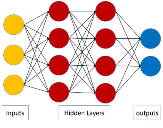 The architecture of an artificial neural network (ANN) is typically composed of the input layer, the hidden layer(s), and the output layer [43]. The nodes in the input layer transmit the information to the nodes in the hidden layer by applying an activation function, each value of each node in the input layer is multiplied by its weight to obtain a new value, and then the new value of each node in the hidden layer is multiplied by its weight and pass to the node in the output layer by applying an activation function to get the final output [44]. The weights are assigned during training the ANN to minimize errors between the outputs and the targets [45]. The architecture of the ANN is shown in Figure 2.