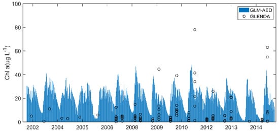 The simulations provided by GLM-AED were compared with the observed surface water temperature and Chl-a from 2002 to 2015. The time-series of surface water temperature showed that the model reproduced the annual variations of water temperature, varying between −5 °C in winter and 25 °C in summer (Figure 3). The RMSE and MAE were 2.95 and 2.75 °C, respectively, which were comparable to previous studies with the applications of the one-dimensional model with an RMSE value of 1–6 °C [53] and three-dimensional model with an RMSE value of 1–3 °C [54] to Lake Erie. In Figure 4, both predicted and observed Chl-a peaks occurred in 2011, with high cyanobacteria in summer (optimum temperature of 25 °C) and diatoms in early spring (optimum temperature of 9.8 °C) [55]. The Chl-a RMSE and MAE were 19.61 and 18.23 , respectively. These errors are comparable to previous studies; for example, Trolle et al. (2008) have obtained an RMSE of 10.4–12.76 in Lake Ravn in Denmark with the application of the one-dimensional DYRESM-CAEDYM (Dynamic Reservoir Simulation Model-Computational Aquatic Ecosystem Dynamics Model) [56]. Silva et al. (2014) underestimated about 110 in Río de la Plata with the application of the three-dimensional ELCOM-CAEDYM (Estuary, Lake and Coastal Ocean Model-Computational Aquatic Ecosystem DYnamics Model) [57]. Disparities still occurred between predictions and observations, which may be due to the simplification of the complicated ecological processes; for example, our model GLM-AED assumes there is no horizontal variability (horizontally averaged) [37]. The parameters used in this model during calibration were listed in Appendix C and Appendix D.