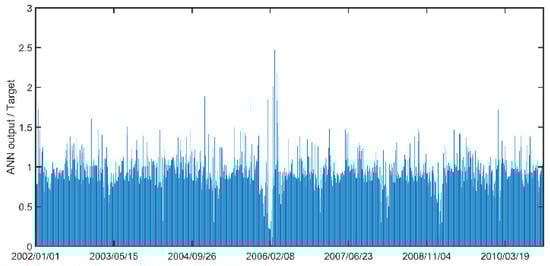 In the training process of the ANN model, to obtain the smallest errors, the number of the hidden layer was selected as 15. The sigmoid function was used as the activation function between layers. The learning rate, momentum, and batch size were 0.3, 0.2, and 100. With trying different percentages of the database for training, 66% of the total data (2002–2010) and 34% of the total data (2011–2015) were used for training and testing, respectively. Figure 5 showed the scatter density plots for Chl-a concentrations between the predictions from the ANN model (y-axis) and the targets from GLM-AED (x-axis) from 2002 to 2010. The value of R2 was 0.83; thus, compared to the value of approximately 0.73 in the previous study [46], our ANN model can reproduce the target Chl-a concentrations. The RMSE and MAE values during the training process were 3.20 and 2.53 , respectively.