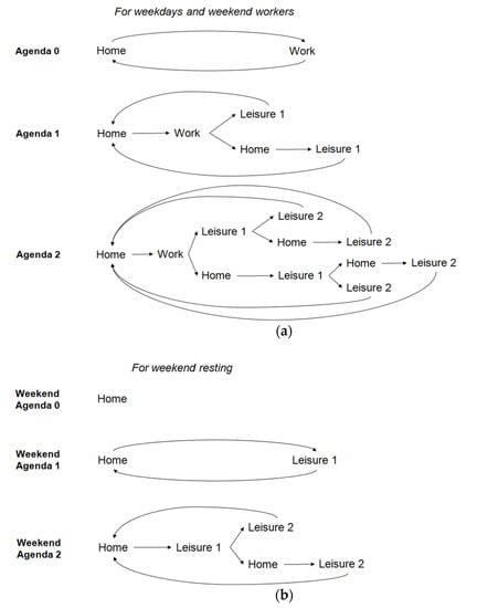 The people agents’ number is the independent variable, editable by the user, to represent the mobile application users in the area in question. Every people agent has a specific apartment of a building as a home and another as a workplace, as in the periodic mobility model of []. It is assumed that both buildings are located within the map and are randomly distributed. Each people agent has a daily agenda, different for each day of the week. This agenda involves working, resting and performing leisure activities (e.g., shopping, visiting a friend, going to a restaurant). For the weekdays, as also depicted in Figure 1a, all people agents are assumed to commute to work and perform their leisure activities depending on their agenda, ranging from none to two leisure activities per day, based on the insights for the citizens’ daily mobility networks of [,,]. Thus, at the start of each day and if the day is a working day, each people agent is assigned one of the three agendas depicted in Figure 1a. The agents may: (a) commute only to work and go back home (agenda 0), (b) have one leisure activity during the day, either directly after work or after going home first (agenda 1), or (c) have two leisure activities that they may choose to perform right after work, one after the other, or go back home before the first and/or before the second (agenda 2).