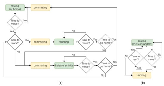 People agents move at specific times of the day, different for each person, but within regular working and leisure hours, adjustable during the experiment. They move either on foot or by using means of transport, simulated by giving different speeds to their movement. Every individual’s movement has an origin and a destination, following the shortest route within the road network. The framework supports two different modes for the decision on the mobility status of the people agents. The default one is for the agent to walk if the distance to be covered is short (i.e., less than 1 km) and to drive otherwise. The second mode allows the user to run experiments by giving percentages of people agents who move by ‘walking’ and those ‘driving’. This mode is appropriate when demographic data for the area in question are available. The people agents’ behaviour can also be represented by their different states and the functions implemented in the system to shift between them, as depicted in Figure 2a. The agents have three static states: working, resting at home, and performing leisure activities. They also implement functions to define the conditions and the timing for these shifts to occur. The day for all people agents starts from the ‘home’ state; then, they commute to ‘work’ according to a schedule based on their agendas. They may also go directly to a ‘leisure activity’ if it is a weekend (Figure 1b). When at ‘work’ or the location of the ‘leisure activity’, other functions define the terms for their transition to a new state.