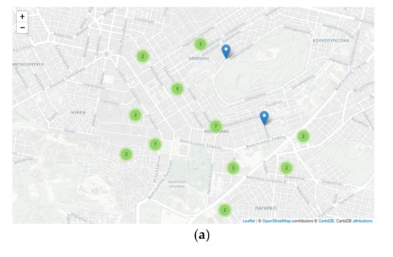 Furthermore, we had to make several assumptions and simplifications about the citizens and the missing child to build the model. We aimed to simulate the case while continuously refining our model to bring it closer to reality. Our next steps regarding the development of the simulation involve further advancements, including (a) the integration of traffic information and its impact on the agents’ mobility, (b) the addition of POIs for the citizens as well, since the distribution of citizen sensor observations is also quite critical, (c) the creation of profiles for the people agents, as in [], such as teenagers, working people, and seniors, (d) the addition of a new travelling mode, namely, the use of public transport, that follows different routes and movement speeds, and (e) the creation of the ‘outside’ agent, to represent all the cases where the working or home place is outside of the simulation.