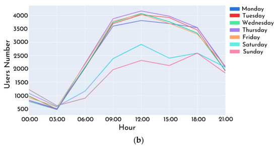 Figure 3 shows the 39 cell sites’ locations and the total number of connected users per hour and weekday for all the participating cell towers. Athens centre being a commercial district, its dataset allowed examining the effects of commuting to workplaces and leisure activities, such as shopping. The datasets also enabled the approximation of the citizens’ number commuting there and the identification of users’ density maps and, consequently, patterns for the centre of Athens. The derived maps show the mobile phone users’ distributions, indicating the total population distribution. Linear regression models have been proposed to extract total population numbers and distribution [].