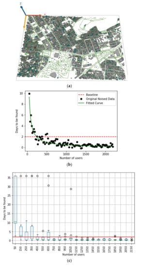 Figure 4a provides a screenshot from the simulation framework during an experiment where there are 600 users at the simulated centre of Athens and the missing child. The experiments conducted for the Athens centre highlighted how this simulation framework could be used to examine the necessary adoption rates of such a citizen sensing mobile application per area to be successful. The results for the first indicator, days for the child to be found, are shown in Figure 4b,c. A horizontal dashed line at days equal to 2 has been added to show the baseline value of the experiment. It can be seen in Figure 4b that the median values of the days for the missing child to be found for the different number of users create a curve resembling a hyperbola. Indeed, fitting the data through nonlinear regression to different curves, the best fit, by using nonlinear least-squares minimisation, was found to be: