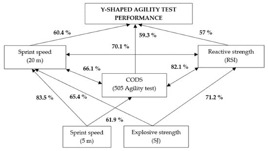 Percentual contributions of factors determining Y-shaped agility test performance based on the coefficients of determination for the tests described in this work for handball players.
