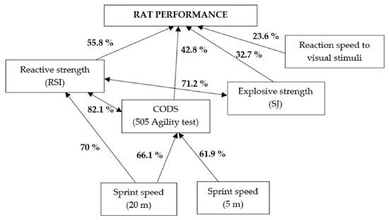 With regards to the hierarchical model of the RAT, its performance in the first-order factors is determined by reactive strength (55.8%), change in direction speed (42.8%), explosive strength (32.7%), and reaction speed (23.6%) in handball players. The importance of jumping capacity and reactive strength for stop-and-go CODS performance in athletes has also been proven by another study []. The speeds for the 5-m-long and 20-m-long sprints determined the performance in the RAT for the second-order factors due to the significant relationship with time in the 505 Agility test.