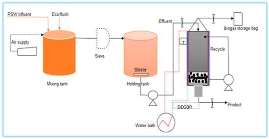 Most reactors have operational challenges which range from clogging, longer processing time and lower efficiencies [9]. However, one of the most successful and effective process equipment used in the treatment of wastewater is the static granular bed reactor (SGBR) [10]. In the SGBR, PSW is fed at the top of the reactor where it flows downward via a bed of anaerobic granules. However, some problems may be encountered during the operation of the SGBR, including clogging and sludge wash-out, which are caused by high and excessive concentrations of biomass growth [7]. The excessive concentration of biomass growth generally leads to lower COD removal efficiencies. An important aspect that can assist in the treatment of PSW is the use of a novel bioremediation agent called Eco-flushTM in the pre-treatment step, which is followed by the down-flow expanded granular bed reactor (DEGBR). The DEGBR was designed to mitigate the challenges experienced by the SGBR [11]. The DEGBR is a modified adaptation of the SGBR that is fitted with a recycle stream on the side of the reactor, which is used for recycling effluent from the bottom of the reactor to the top [11]. This is meant to prevent issues such as flow channeling, to improve the distribution of the feed to the biomass, and to implement intermittent fluidization whenever it is required using a top-down recycling strategy.