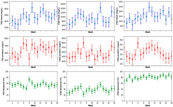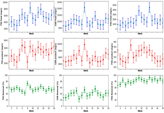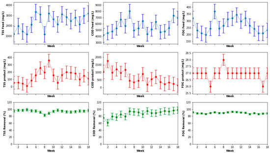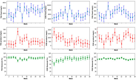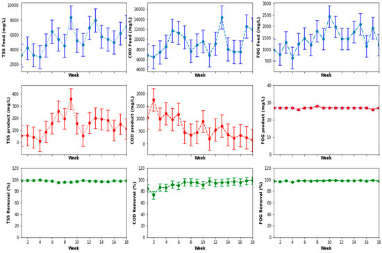 The performance of the pretreatment system is shown in Figure 6. The fluctuations in the quality of the feed and product of the system and the corresponding removal efficiencies after the data processing indicated FOG removal efficiency oscillating around 80%. Furthermore, Figure 6 also shows removal efficiencies of the TSS and the COD ranging between 45% to 80% for the TSS, and a variation between 25% to about 60% for the COD. These removal efficiencies fluctuated with the quality of the feed to the system. Overall, the pre-treatment system culminated in an average removal efficiency of 80 ± 6.3%, 38 ± 8.4% and 56 ± 7.2% for the FOG, COD and TSS, respectively.
