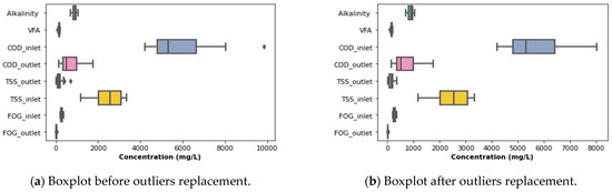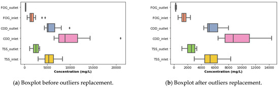 From Figure 9a, it can be observed that the distribution of the inlet COD and TSS had an outlier each. These outliers were replaced with the median value of each affected distribution, as depicted in Figure 9b. From the latter, it can be observed that the data processing step addressed the challenges associated with the presence of outliers in the listed distribution and led to a further analysis of the performance of the DEGBR, as illustrated in Figure 10 indicating how the fluctuations varied for the concentration of TSS, FOG and COD at the inlet and outlet of the DEGBR, including their corresponding removal efficiencies.