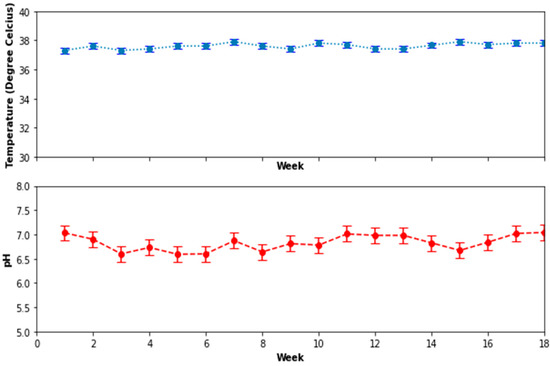 Organic matter degradation happens in the DEGBR and it involves the decomposition of a large organic compounds into a simpler constituent for assimilation. The rate at which complex organic matter is degraded depends on the pH, temperature of the bioreactor, and molecular size of the pollutants including biomass activity [25]. However, there is no overall ideal operational pH, because all processes use consortia of micro-organisms, whose growth rate is differentiated at different pH values [26]. However, obviously, extreme pH can kill micro-organisms, hence there is a need to monitor and control it. This means that the operational pH is a median value which can be tolerated by most enzymes and micro-organisms. Additionally, Figure 14 depicts a variation of the pH and the temperature during the experiment reported herein, and these two parameters were also maintained within a mesophilic range (37 to 38 °C) for the temperature and a suitable pH range of 6.5 to 8.