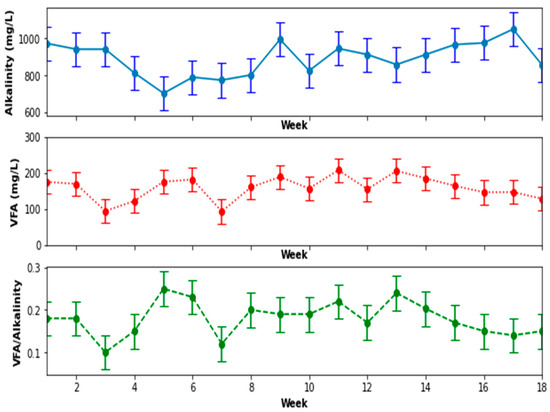 However, despite the highly appraised pre-treatment step, other parameters are essential to a conducive anaerobic digestion in the DEGBR. These included the VFA/Alkalinity ratio that reflected a good acidic and alkaline balance within the bioreactor. Ideally, this ratio should be kept under 0.3 for a stable anaerobic operation [7]. A VFA/Alkalinity ratio test was performed in order to establish the progression in the digestion of the PSW and the stability of the reactor. Figure 15 shows average values of alkalinity, which ranged between 1048 to 702 mg/L, whereby the average VFA of 157.97 mg/L, and the alkalinity of 888.12 mg/L, culminated in the VFA/Alkalinity ratio of 0.2. Such a VFA/Alkalinity ratio was satisfactory, albeit slightly low for a high-performance reactor as compared to other similar processes used for anaerobic digestion. This was the case for the DEGBR, as illustrated in Figure 15, that provides a variation of the VFA/Alkalinity ratio, including the variation of the alkalinity and VFA concentration, throughout the experiment.