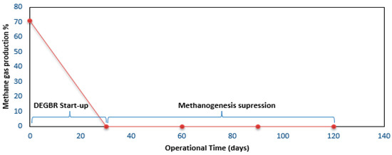 Biogas production happens in a process called methanogenesis. However, before methanogenesis, the bacteria in the reactor converts fatty acids and alcohols into acetic acid, hydrogen, and carbon dioxide. Methanogenesis is the process whereby acetic acid, hydrogen and carbon dioxide products are degraded to produce methane and carbon dioxide [28]. Ordinarily, a suitable OLR and HRT can result in the production of methane gas [12]. Furthermore, it has been established that presence of ammonium-nitrogen (NH4N) in the system can inhibit methane gas production [29]. It was reported in another study whereby a static granular bed reactor (SGBR) was used for the treatment of industrial wastewater that the biogas production increased with the increase in the organic loading rate [30]. For this research project, it was found that biogas production was reduced from 0.3 L CH4/g.COD (71%) degraded to being non-existent (0%) after 30 days from the initial start-up period, as shown in Figure 16. This was attributed to the continuous supply of facultative bacteria present in the bioremediation agent (Eco-flushTM) which was hypothesized to have had an effect of suppressing the methanogenesis process in the DEGBR.