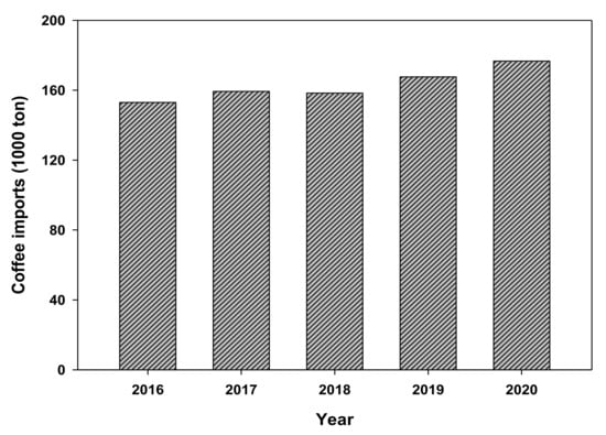The production and consumption of coffee is increasing worldwide. Since the 2000s, the popularization of coffee-drinking culture has contributed to the significant growth of the coffee shop market, and there has been a growing demand for various types of coffee products. As shown in Figure 1, the annual coffee imports of South Korea have tended to increase each year, with a total of more than 700,000 tons imported over the last five years [1]. Accordingly, the amount of spent coffee grounds (SCGs), the by-products generated after coffee extraction, has also continuously increased. Although some SCGs are used as compost, most are disposed of through incineration and landfills [2]. Therefore, there has been a growing interest in technologies that use SCGs as a renewable energy source [3].