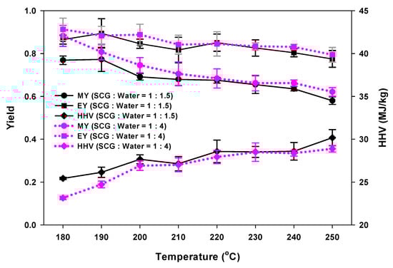 Variation of mass yield (MY), energy yield (EY), and higher heating value (HHV) of solid coffee grounds (SCGs) with different reaction temperatures and water contents.