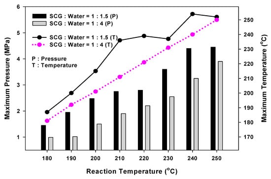 Figure 3 also shows that slightly higher HHVs and lower mass yield values were obtained with an SCG–water ratio of 1:1.5 than with a ratio of 1:4. The changes in HHV and mass yield indicate changes in the material properties of the sample due to the hydrothermal carbonization reaction. Therefore, the hydrothermal carbonization reaction was judged as more active with a ratio of 1:1.5 than with a ratio of 1:4. However, this is likely due to the temperature control of the reactor rather than the gap of water content. Figure 4 shows the variation in the maximum temperature and pressure with the reaction temperature under each water content condition. Different maximum reaction temperatures and pressures occurred with each water content condition, even though the same stirrer and PID controller were used to maintain a constant temperature in this study. This is likely due to the influence of stirring under each water content condition. In other words, the water content was sufficient for uniform stirring when the SCG–water ratio was 1:4, whereas uniform stirring could not be achieved with a ratio of 1:1.5, owing to the insufficient water content. This caused the actual reaction temperature to be higher than the target value PID controller that was unable to control the temperature sufficiently. Therefore, it appears that with ratio of 1:1.5, the sharp increase in heating value and decrease in mass yield around 250 °C resulted from insufficient temperature control during the reaction.