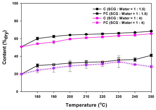 Figure 3 shows the mass and energy yields of SCGs subjected to hydrothermal reactions with varying reaction temperatures and water contents. These values were calculated using Equations (1) and (2) and the heating value analysis results. For both water content conditions, the mass yield decreased as the reaction temperature increased, while the HHV increased. This appears to be because the volatile organic components contained in the SCGs were decomposed in stages as the reaction temperature increased. The energy yield decreased as the reaction temperature increased, because the rate of decrease in mass yield was higher than the rate of increase in HHV, as shown in Figure 3. In particular, changes in mass yield, energy yield, and HHV at a reaction temperature of 250 °C were larger than those at 220–240 °C. This appears to be because the hydrothermal carbonization reaction occurred more rapidly near 250 °C. Because a sharp reduction in mass and energy yields may not be desirable in terms of energy recovery, a reaction temperature between 220 and 240 °C is considered desirable for SCGs’ hydrothermal carbonization.