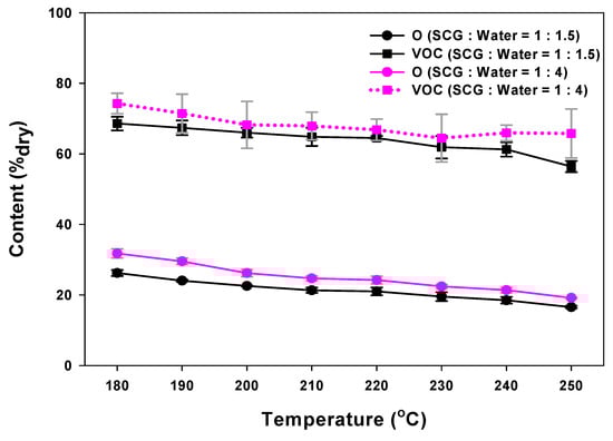 To investigate fuel characteristic changes in hydrothermal carbonized samples [11,20], Figure 5 and Figure 6 and Table 2 and Table 3 show the results of elemental and proximate analysis of the SCGs raw material and reaction products under different conditions. While the carbon and FC contents increased as the reaction temperature increased, as shown in Figure 4, the oxygen and VM contents decreased (Figure 5). This confirmed that the decomposition of volatile oxygen-bearing components during the hydrothermal carbonization of SCGs led to a relative increase in the carbon content. On the other hand, Table 2 and Table 3 show that there was almost no change (less than 1%) in the amount of nitrogen and ash components. The products obtained with a 1:1.5 water content exhibited higher carbon and FC contents than those obtained with the 1:4 condition, but showed lower oxygen and VM contents. In particular, when the SCG–water ratio was 1:1.5, the VM content decreased sharply, while the amount of FC was significantly higher at 250 °C compared to when the ratio was 1:4. This is likely because the maximum reaction temperature was more influenced by the reaction temperature control process rather than by the water content, as mentioned previously. Table 2 and Table 3 show that similar to the reaction temperature, the water content had no effect on the nitrogen and ash contents.