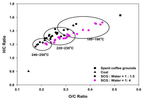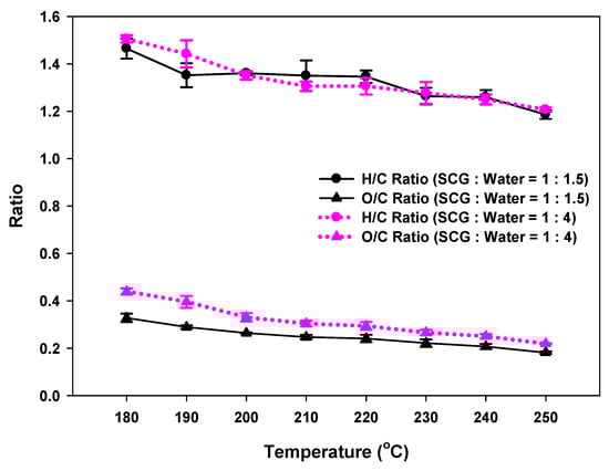 To investigate changes in the fuel characteristics of the SCGs reaction products subjected to hydrothermal reactions, the O/C and H/C ratios were determined for the reaction products produced with different reaction temperatures and water content (Figure 7). At both water contents, the O/C and H/C ratios decreased as the reaction temperature increased, with the 1:1.5 condition resulting in lower values than the 1:4 condition under most temperature conditions. In particular, the O/C ratio was more affected by the water content than the H/C ratio. This is likely, as the elemental analysis results in Table 2 and Table 3 show, because there was hardly any change in the hydrogen content with increasing reaction temperature, at both water content conditions, while the increase in carbon content and the decrease in oxygen content.