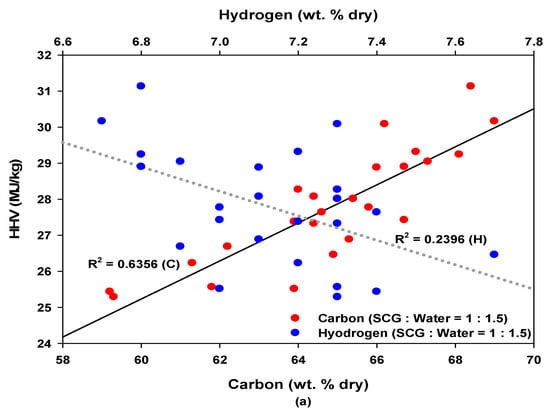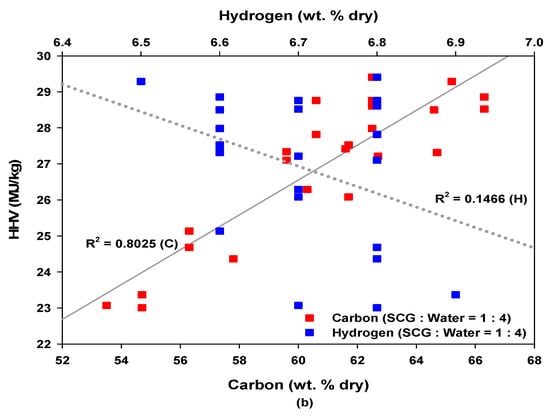 Correlations between carbon and hydrogen contents and the HHV of hydrothermally carbonized SCGs produced with different reaction temperatures and water contents: (a) SCG: water = 1:1.5; (b) 1:4.