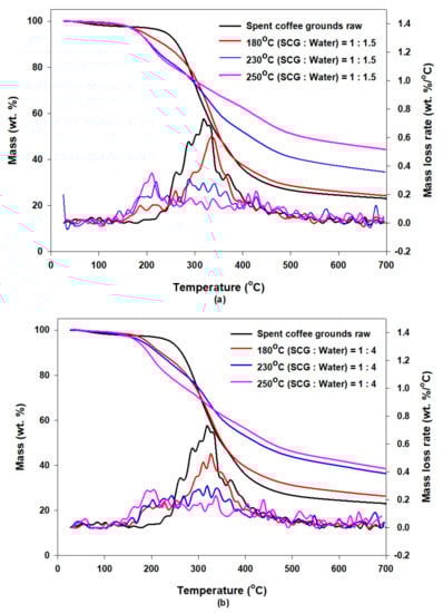 Thermogravimetric analysis (TGA) and derivative thermogravimetry (DTG) curves of raw and hydrothermally carbonized SCGs produced with different reaction temperatures and water contents. (a) SCG: water = 1:1.5; (b) 1:4.