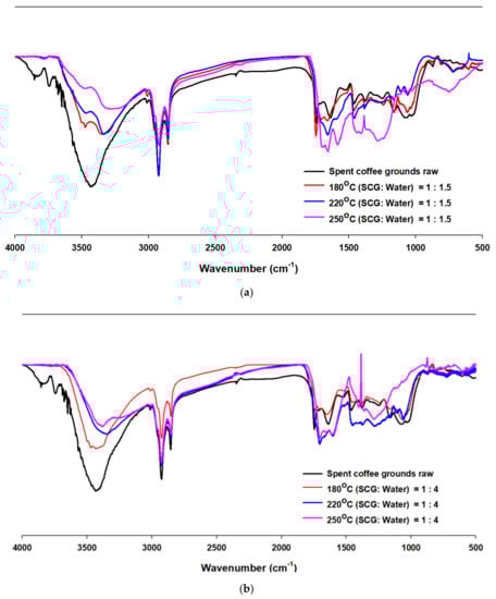Fourier transform infrared spectroscopy (FT-IR) spectra of raw and hydrothermally carbonized SCGs produced with different reaction temperatures and water contents: (a) SCG: water = 1:1.5; (b) 1:4.