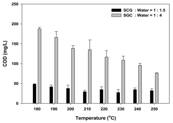 Chemical oxygen demand of SCGs produced with different reaction temperatures and water contents.