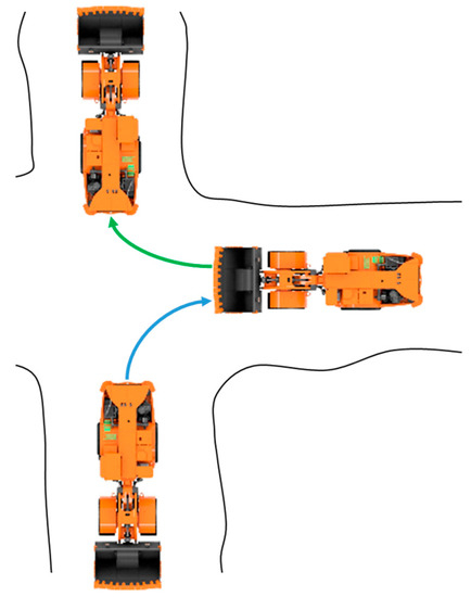 The work of Mäkelä [6] set the basis for the AutoMine software of the LHD manufacturer Sandvik, while the work of Duff, Roberts, and Corke [7,8,9] set a similar precedent for the software MINEGEM of Caterpillar. Only a few years later, the work by Marshall, Barfoot, and Larsson [10,11,12] configured what would become Scooptram Automation of the company Atlas Copco (now Epiroc). These companies have applied their automation solutions directly to their articulated vehicles [13]. Because of their commercial application, only the initial work on the development of the autonomous systems from LHD manufacturers is available in the literature. For instance, autonomous navigation from the manufacturer Sandvik is based on an absolute localization paradigm, i.e., it relies on odometry and detection of natural markers of the tunnel network [6]. Localization is achieved by taking a profile of the tunnel in a 5 [m] long section and comparing it to a known map. Caterpillar, on the other hand, initially based its system on mainly reactive techniques (wall following), in conjunction with a topological map with information about loading points, dump points, intersections, and other markers that are used in an opportunistic location scheme [9]. Finally, Epiroc made use of a hybrid navigation paradigm [11]. A set of behaviors was programmed under a fuzzy logic scheme to form the reactive part, while a higher level (deliberative) planner was used at intersections or open spaces.
