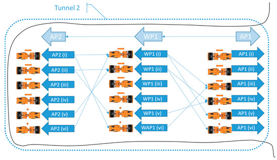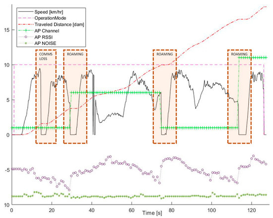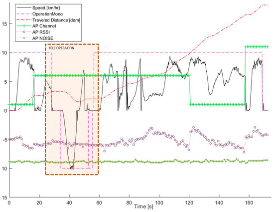 An important problem during tests was roaming between different Wi-Fi access points inside the tunnel. For safety reasons, the system stops accelerating the LHD if communication with the operation station becomes unstable, generating an emergency stop if the loss of communications is longer than a few seconds. Because of this, and a wireless network that did not have fast roaming capabilities, the system often stopped when switching from one access point to another. This can be seen in Figure 15, where stops produced by roaming, and by unstable communications, are shown. The Figure 15 also shows the instant speed of the vehicle (in km/h), the operation mode (with a value of 10 for autonomous navigation, 0 for idle, and −10 for tele-operation), distance traveled (in decameters), the Wi-Fi channel of the access point, at which the LHD is connected (different channels are used for faster roaming), and, finally, the RSSI and Noise values reported by the wireless modem of the vehicle. All the scales have been selected to fit in a single figure, to show the relation better between these variables.
