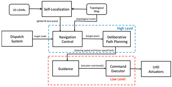 This paper is organized as follows: First, related work on autonomous LHD navigation is presented in Section 2. The proposed topological navigation system for LHD is described in Section 3. Then, in Section 4, the development and testing methodology is described, and in Section 5, validation results achieved in an actual mine are presented. Finally, conclusions of this work are drawn in Section 6.