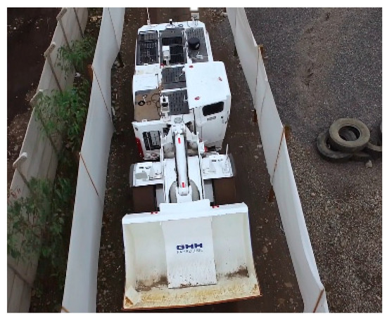 After the system was installed and all basic control, communications, and safety functions were thoroughly tested, the equipment was moved to a test-field nearby the OEM (Original Equipment Manufacturer) facilities in Santiago, Chile. The test-field emulated an underground tunnel by using light material to mimic the walls of the mine (Figure 13), which was enough to trick the system. It also had a dummy loading point, a dumping point, and a truck loading point. These tests were used to calibrate the system controller’s parameters and the kinematic characteristics of the vehicle’s model, such as the acceleration, steering, and breaking response to different operation inputs.