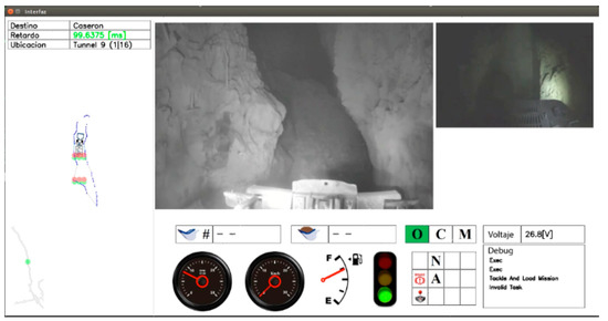 The autonomous navigation tests showed that the system allowed tramming along a 180 [m] tunnel from its entrance to the loading point. The LHD took approximately 2 [min] to go from one point to another, which is comparable to the performance achieved by an experienced human operator. Some of the difficulties that were found included the tunnel being too narrow for the LHD (sized according to the manufacturer’s specifications), and the floor having a large number of irregularities, pot holes, and varying inclinations. Of these factors, only the narrowness of the tunnel was included in the simulated environment. A view of the operator’s control interface is shown in Figure 14.