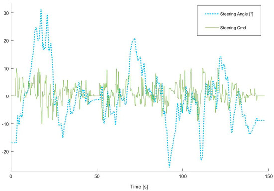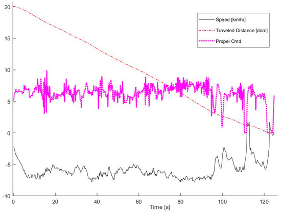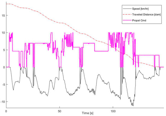 The average and maximum values of both metrics for all datasets are presented in Table 4. Again, the human operator shows a better performance than the autonomous system. The consistency of the human operator is quite remarkable, and it shows its expertise and knowledge of the machine and the tunnel. The autonomous system is also quite consistent on these metrics, but that is usually expected of an automation system. In order to have a better idea of the difference between them, Figure 17, Figure 18, Figure 19 and Figure 20 show the machine inputs (propel and steering) as well as the instant speed and steering angle of the LHD. Figure 17 and Figure 19 show dataset 14, while Figure 18 and Figure 20 show dataset M1. For clarity, Steering command and steering angle have been plotted separately from and propel command and LHD’s speed. Both were made with the LHD having a fully loaded bucket, and with the vehicle moving backward, towards the dump point of the tunnel. Straight lines can be seen in Figure 16 on the propel command line, showing a constant output by the autonomous system. Looking at both figures, it can be seen that the human operator uses fewer steering commands, perhaps showing a better understanding of the LHD kinematics, and, therefore, greater abilities to predict the behavior of the vehicle.