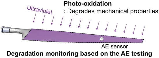Ultraviolet radiation is detrimental to polymers, initiating photodegradation, which usually degrades their mechanical properties [13]. Zhang et al. [15]. exposed epoxy to UV light for up to 200 h and then observed the surface by scanning electron microscopy. Microcracks occurred on the surface exposed to UV radiation, and the damage became more severe as the surface cracks enlarged, with increasing amounts of accumulated energy. Various combinations of composites were tested for up to 100 days of photodegradation [16]. The ultimate tensile strength and modulus of FRP decreased with increasing UV exposure. Therefore, for the maintenance and residual life evaluation of wind turbine blades, it is essential to predict changes in the fracture behavior of FRPs exposed to UV radiation during their life cycle. It is important to establish efficient monitoring technology due to the difference between natural exposure and laboratory conditions.
