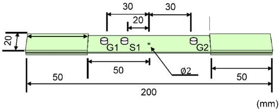 Tensile testing was carried out according to the standard ASTM D3039. Tabs of GFRP were attached to a specimen at both ends to avoid damage from the test jig. A universal testing machine (AGI; Shimadzu Corp. Kyoto, Japan) was used to test specimens at a crosshead speed of 0.1 mm/min. AE signals were detected using a digitizer (Physical Acoustics Corp.; PCI-2, Princeton Junction, NJ, USA) at a sampling rate of 10 MHz per channel during each test, with 2/4/6 preamplifiers (Physical Acoustics Corp., Princeton Junction, NJ, USA) at 40 dBAE gain. A PICO sensor from Physical Acoustics Corporation (PAC; Princeton Junction, NJ, USA), with an operating frequency range from 100 to 900 kHz, was chosen for AE testing. Three AE sensors were mounted on each specimen at different distances from the hole using silicon grease (HIVAC-G, Tokyo, Japan) and vinyl tape (Figure 2). The specimens broke near the center hole due to stress concentration. Table 1 lists the test conditions used in previous research for AE monitoring [30]. One sensor was applied near the hole and two guard sensors were applied in both ends of the specimen (S1, G1 and G2 in Figure 2), and the AE signals of the hole (crack) areas were analyzed. Only signals stronger than 35 dBAE were detected to remove the background noise (Table 1). Four specimens were tested for each UV irradiation condition and the reproducibility was confirmed, selecting one representative set of data.