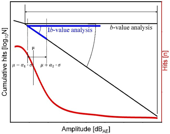 The b-value reflects structural health and has been used to assess signals from stochastic processes, such as earthquakes, and from concrete structures. An Ib-value that incorporates specific statistical parameters of the amplitude distribution was derived. In Ib-value analysis, the crucial factors for determining the amplitude range are the mean (μ), standard deviation (σ), lower amplitude (μ − a1∙σ), and upper amplitude (μ + a2∙σ) values (Figure 4; note the slope of the blue line). The Ib-value was then calculated as follows: